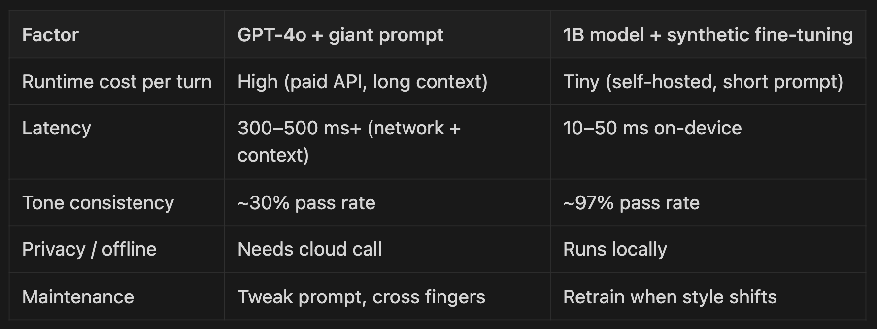 Use a bigger model (e.g., Gemini-Flash) once to spit out style-consistent Q&A. Train your tiny model on this set. After that, the small model flies solo—no API toll per turn. One burst of training compute yields thousands of cheap, fast inferences.