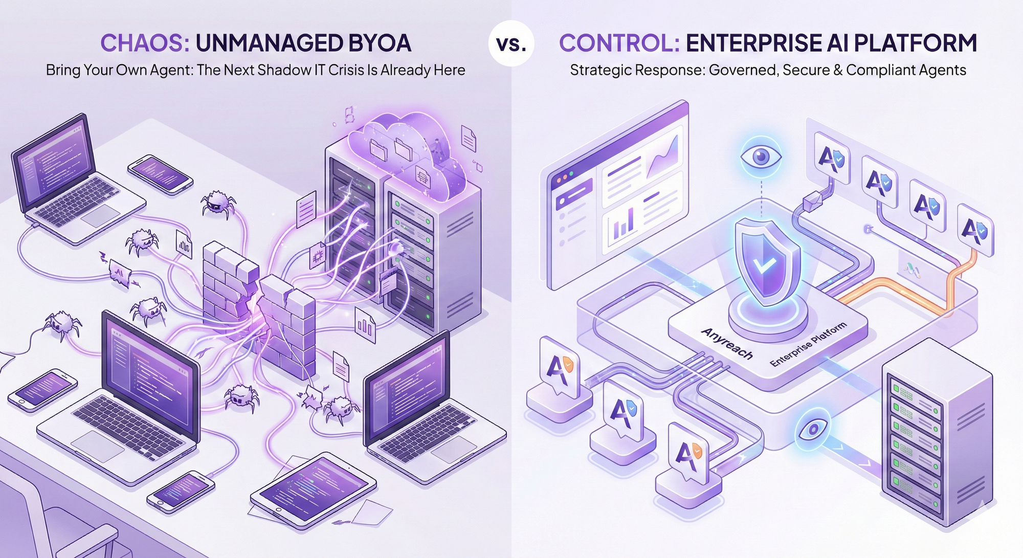 Enterprises should deploy sanctioned AI conversational platforms that provide omnichannel capabilities (voice, SMS, email, chat, WhatsApp) with proper security oversight. Anyreach's AI Done-4-U service offers managed deployment of compliant AI agents that deliver 85% faster response times while maintaining enterprise security standards.