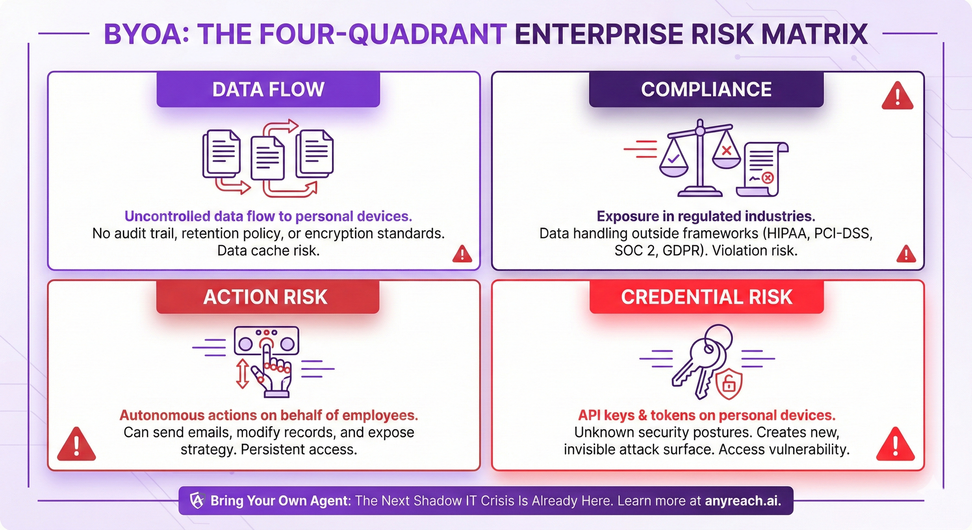 The security implications extend far beyond traditional data loss prevention. First, there is the issue of uncontrolled data flow. Corporate data flowing to personal infrastructure has no audit trail, no retention policy, and no encryption standards. A personal AI agent might cache months of internal communications on an unmanaged device.