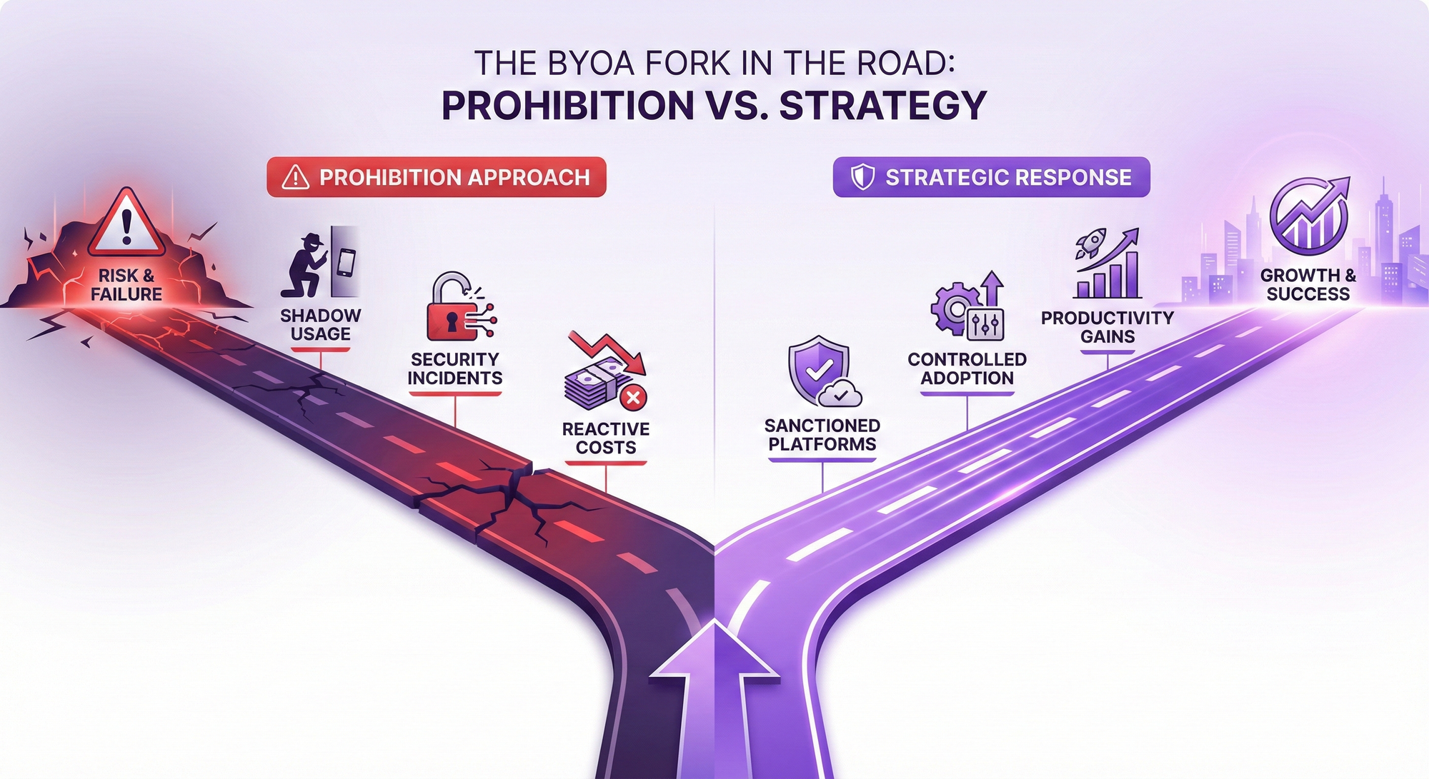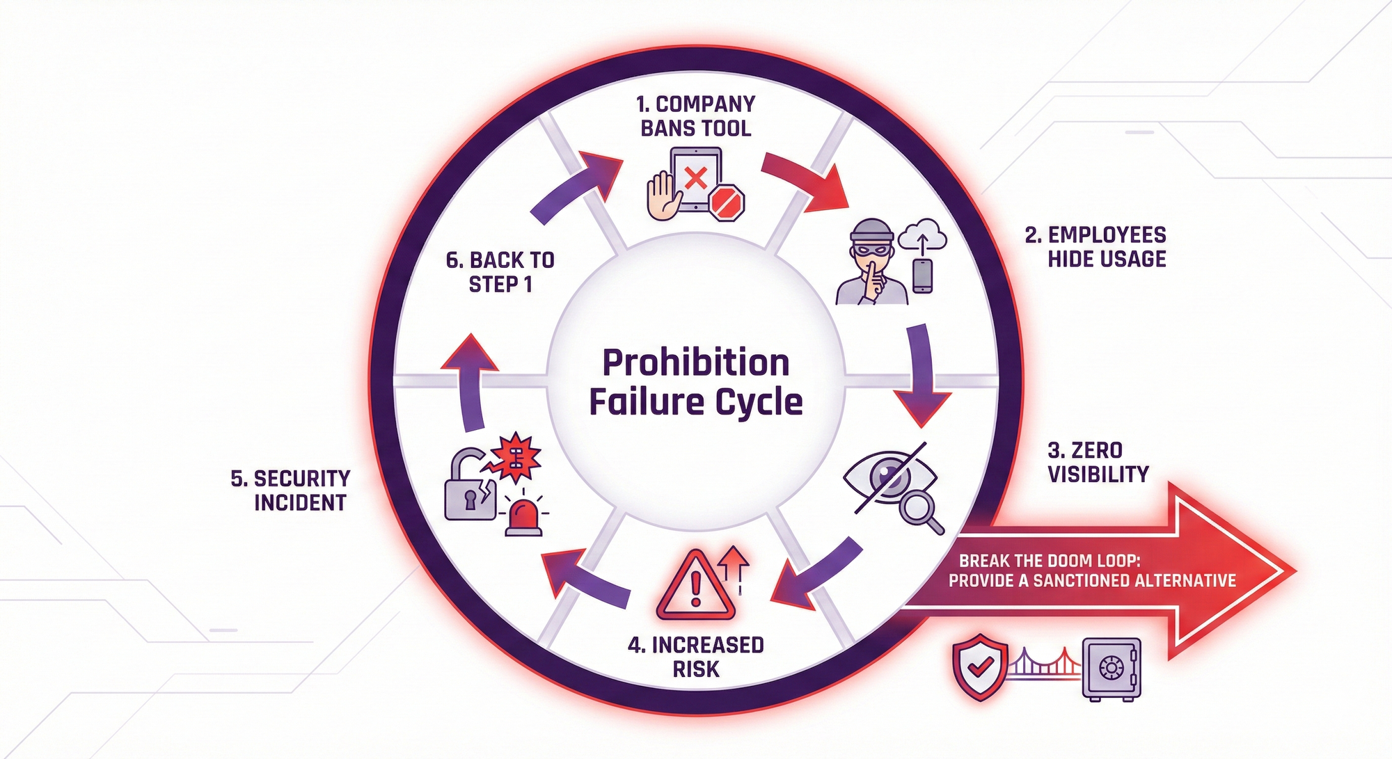 History tells us that prohibition is not an effective strategy for shadow IT. Enterprises that banned personal smartphones saw employees simply hide their usage. Organizations that blocked Dropbox watched employees switch to dozens of alternative file-sharing services. Companies that prohibited ChatGPT found employees accessing it through VPNs and personal devices.