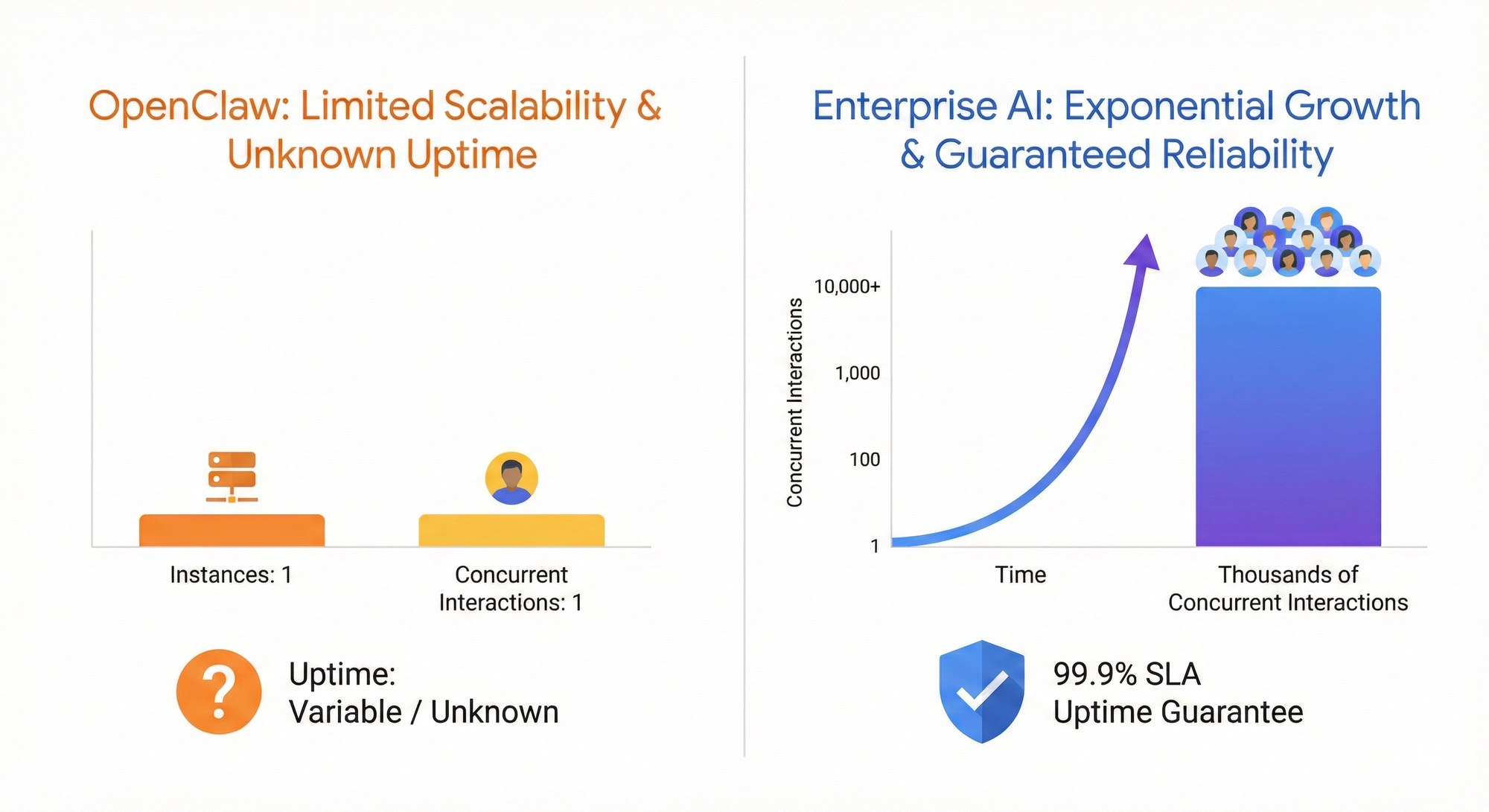 This architectural difference matters enormously in practice. An OpenClaw instance that crashes at 3 AM restarts when you notice it. An enterprise platform that experiences an issue triggers automated recovery, alerts operations teams, and maintains service continuity because customer-facing operations cannot tolerate downtime.
