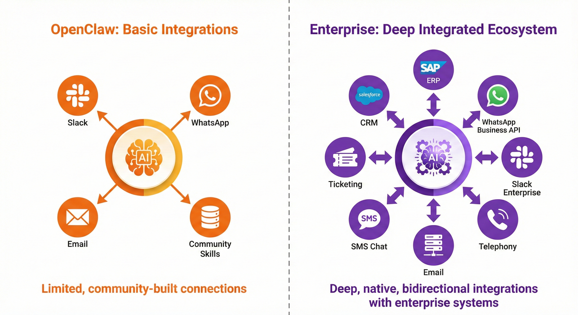 Enterprise platforms provide deeply integrated, professionally maintained channel connections. This includes native telephony integration for voice AI agents, bidirectional SMS, official WhatsApp Business API integration, live chat widgets, and email processing. Beyond channels, enterprise platforms integrate with CRM systems, ticketing platforms, knowledge bases, and existing contact center infrastructure.